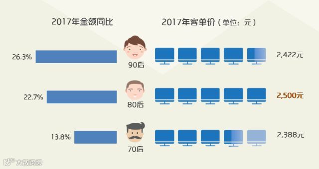 70后始终作为社会消费总金额首要贡献人群,2017年70后消费占整体交易规模的近一半;