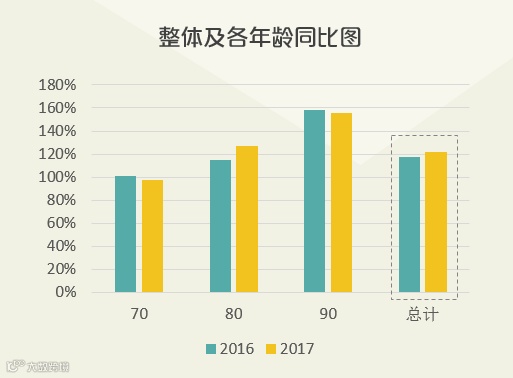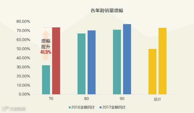 90后消费金额增长迅猛,同比增长73%,远高于70、80后,增幅达70后的近两倍。