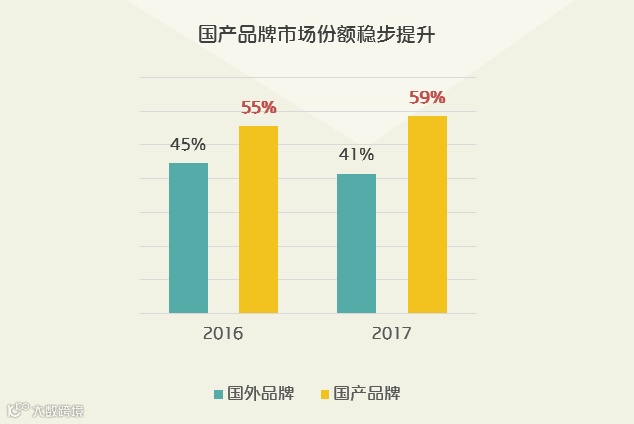 国产品牌市场份额快速提升,已占市场近六成规模, 同时国产品牌迅速从中低端产品向中高端升级。