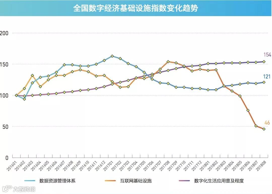 此外,基础指数也持续走低。2018年8月,基础指数录得107,环比增速下降0.32%,对中国数字经济指数增长呈现-0.8%的负贡献率。数字经济基础指数度量从数据的获取、传输、存储和使用四个角度来度量数字经济基础设施的增长,包含数据资源管理、互联网基础设施和数字化应用普及程度。这三个分项指数分别为121、46和154,环比增速分别为 -1.8%,-8.8%和0.8%。数字化生活应用普及程度仍保持微弱增长,数据资源管理指数本月小幅上升,互联网基础设施相关项目采购量则持续下降。从图中可以看出,自2018年3月以来,互联网基础设施一项的大幅下挫一直是导致基础指数降低的主要因子,在本期各项指数都出现回暖下,该项指数依然保持下行趋势,可以初步判断我国的互联网基础设施采购已经进入相对饱和的阶段,互联网基础行业进入到成熟发展阶段。