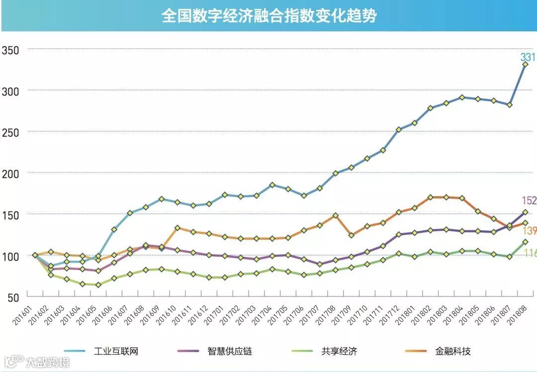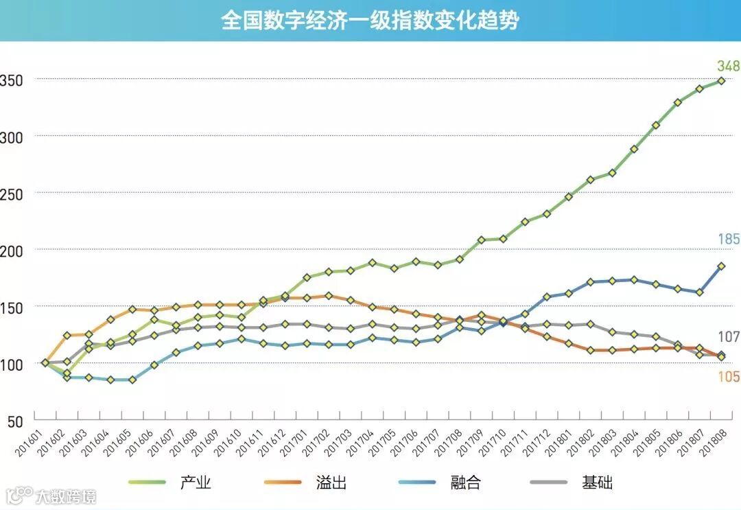 2018年8月,中国数字经济指数录得431,一改5月份以来一路下行的趋势,陡然掉头回暖,创下历史新高,环比增长18.7%,同比增长47.6%。中国数字经济指数包含产业指数、融合指数、溢出指数和基础设施指数。本期中国数字经济指数回升动力主要来自融合指数的骤然增加。2018年8月融合指数录得185,环比增长13.95%,对数字经济总指数的贡献率达31%。产业指数本期继续保持较高位序,录得348,环比增加2.22%。