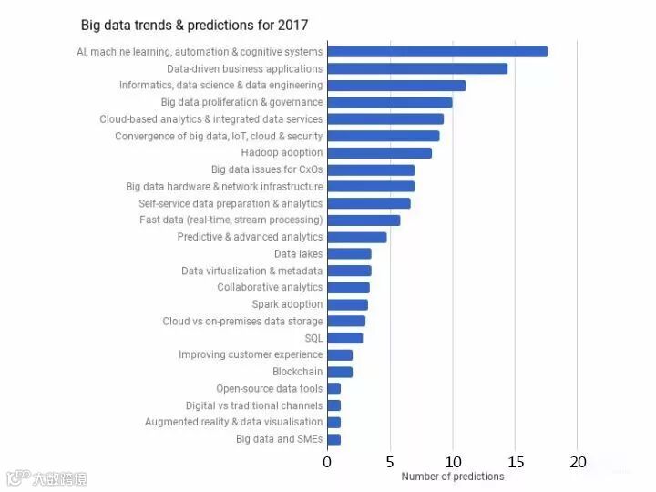 每年,各种技术领域的专家都会对当前的趋势进行总结,并对未来12个月做出预测。大数据也不例外,我们整理了多个专家在2017年做出的预测,并对这些预测进行了分类。以下是一些分析结果: