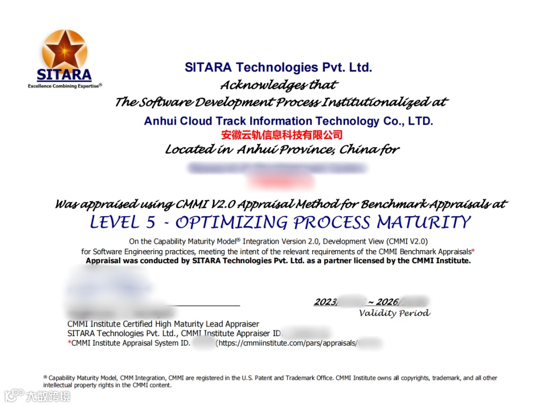 近日,经国际权威机构评估,安徽云轨信息科技有限公司通过全球软件领域CMMI五级(简称CMMI5)认证,荣获CMMI5级证书!