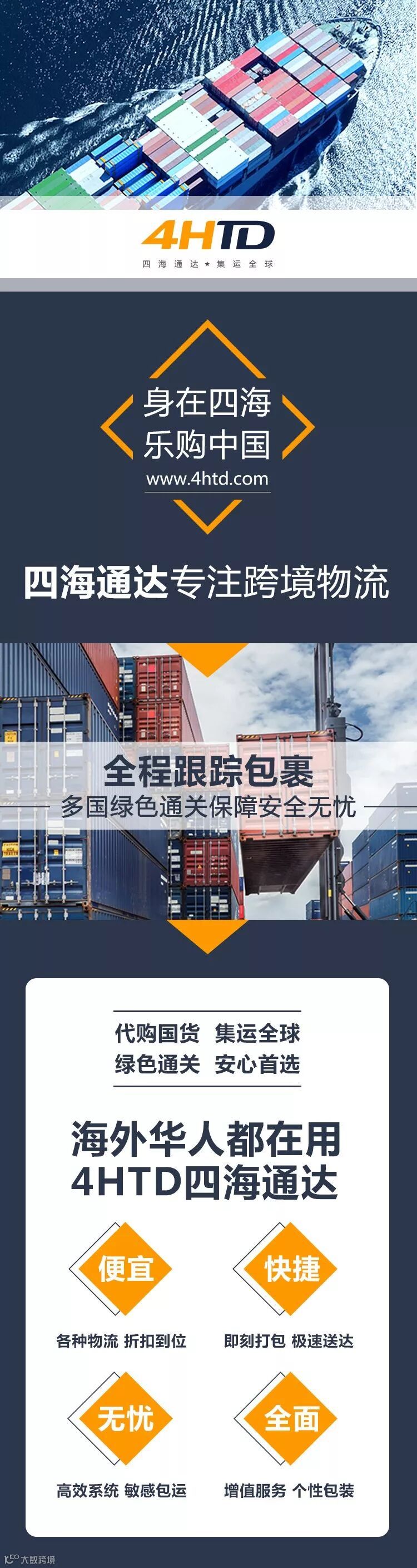 4HTD由一级转运企业四海通达发起成立,旨在成为海外用户网购中国的领先品牌,让海外客户以最便捷的方式享受中国制造之美!4HTD自成立以来为全球200多个国家地区的用户提供了非常优质的代购集运服务,深受全球用户的喜爱,拥有极高的信誉和美誉度。