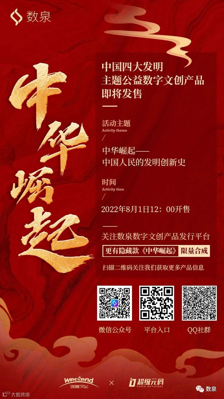 8月1日,上海西区文化传媒发展有限公司、超级元码(上海)数字科技有限公司联合数泉数字文创产品发行平台,共同推出“四大发明”历史主题系列公益数字藏品,传播科技创新对文明发展的影响,以推广国家“鼓励科技创新 发展科技强国”的号召。同时本次藏品发售所得,将捐给相关公益基金组织。