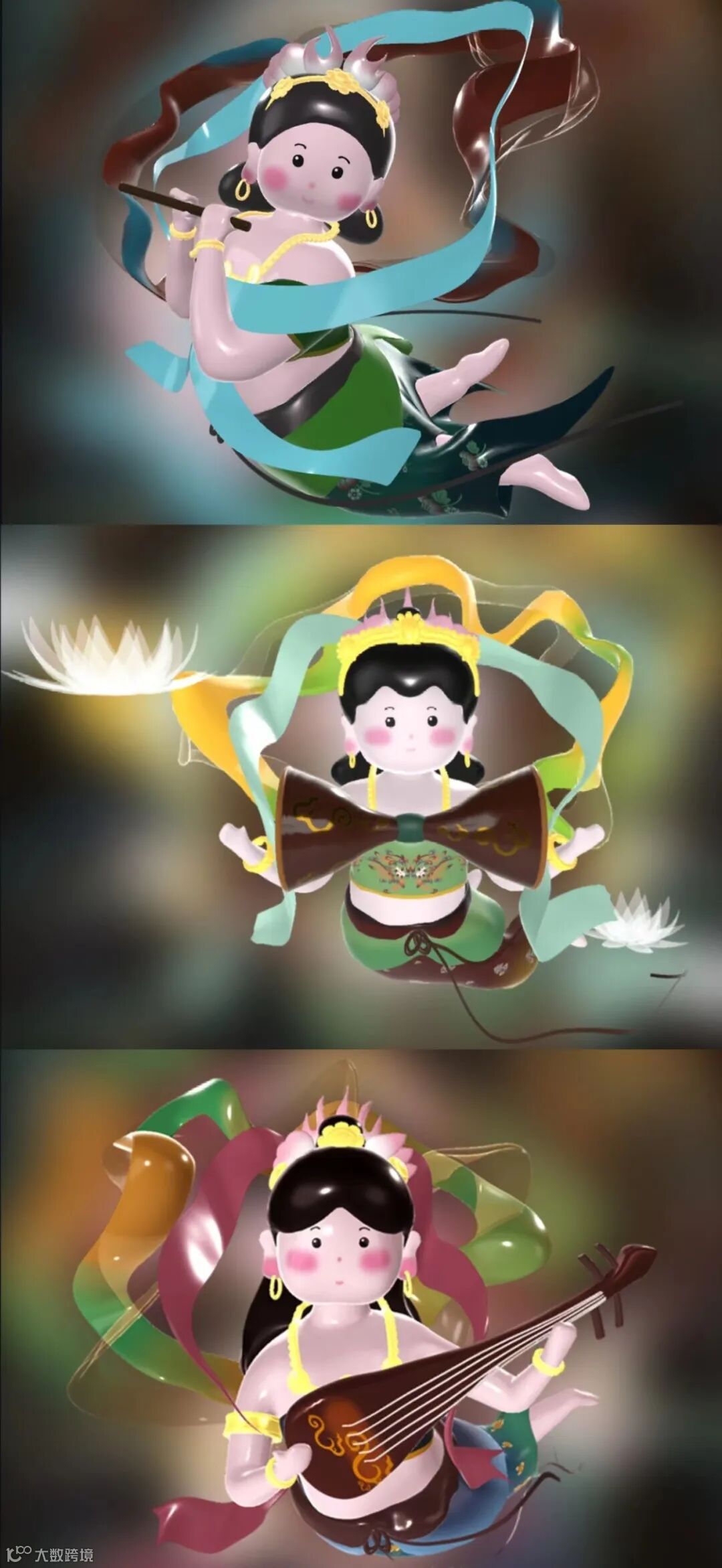 该系列数字藏品将敦煌美术馆藏文物《390窟飞天》进行二次创作,动作造型及衣饰纹样均参考真实壁画与史料,并融合隋唐风韵进行了Q版卡通化风格创作。三位神女飘逸自如、舞姿各异,分别演奏着琵琶、腰鼓、长箫,高还原度的披帛与衣裙无风自动,敦煌传统的云纹、忍冬、卷草、蜀葵等纹样点缀其间。3D全景技术手段将使馆藏文物飞天少女的形象更加淋漓尽致地呈现在各位藏友面前,同时该藏品也会在ADM元宇宙中展露真容。