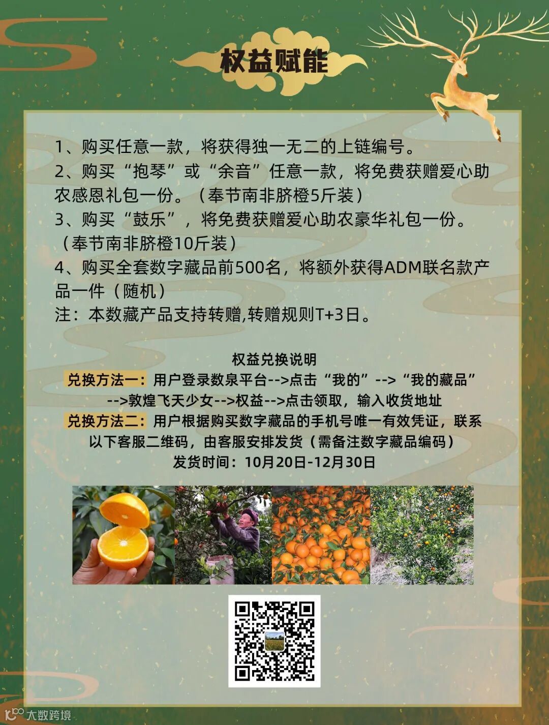 自汉代起,奉节就为皇室进贡脐橙,“园柑长成时,三寸如黄金”,便是“诗圣”杜甫在当地任“桔官”时留下的名句。三峡腹地肥沃的山地土壤,梯田般的山地地形,丰富的长江水资源和充足的阳光,造就了奉节——世界上公认最适宜脐橙种植的地方。然而,今年重庆山林大火奉节成为重灾区,眼看着果农的心血付之一炬,发行方杭州西博文化传播有限公司联手杭州市同心援扶贫基金会、敦煌美术院共同发起“聚力助农,爱满人间”活动,买数藏,送脐橙!