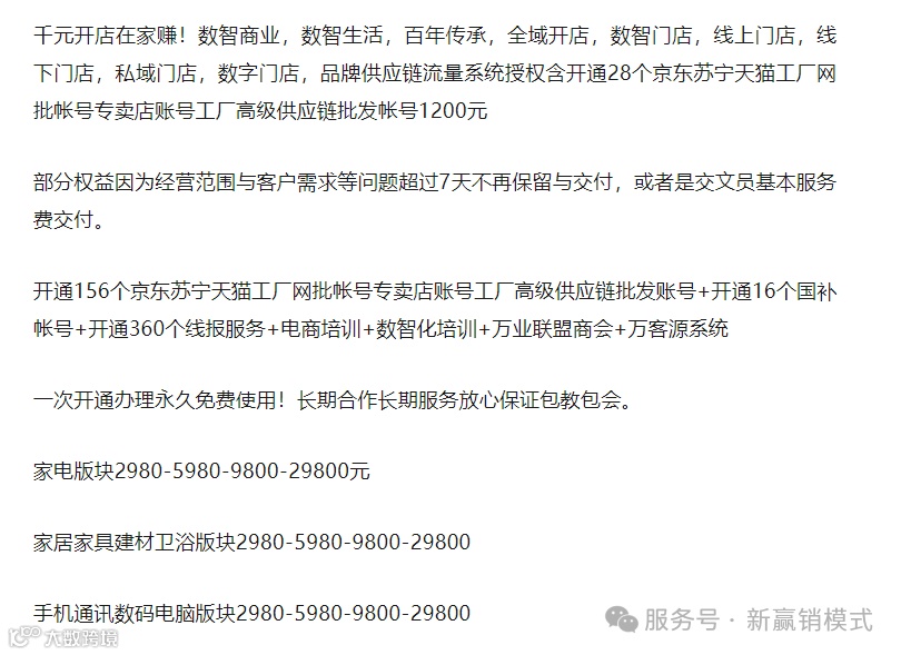 156个京东苏宁天猫工厂网批帐号专卖店账号工厂高级供应链批发账号+线报服务+电商培训+线下课+自己收款小程序H5商城卖货系统+京东家居家电专卖店账号2980