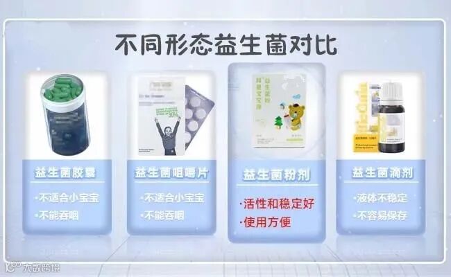 第四看产品产品形态,市面上·益生菌分很多种,有胶囊、咀嚼片、液体滴剂,像胶囊和咀嚼片的话不太适合小宝宝,孩子太小根本不会吞咽,滴剂益生菌稳定性也不是很好,打开后需要在短期内就喝完。袋装的粉状益生菌活性和稳定性相对就比较好,保存也比较方便,也方便携带。