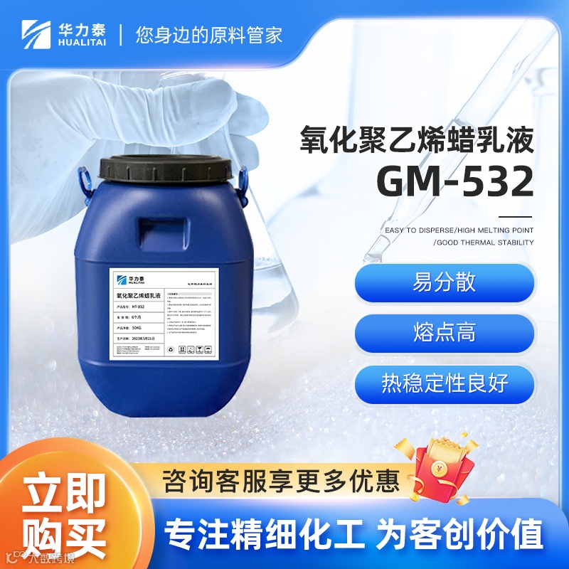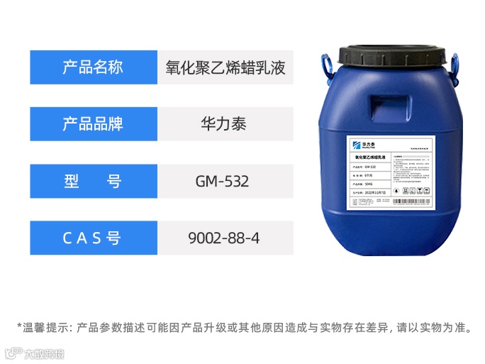 氧化聚乙烯蜡乳液 GM-532 是一种合成蜡乳液,具有热稳定性良好、抗粘防污、耐水、耐酸耐碱、易分散、抗刮耐磨、涂膜硬度较高等性能。