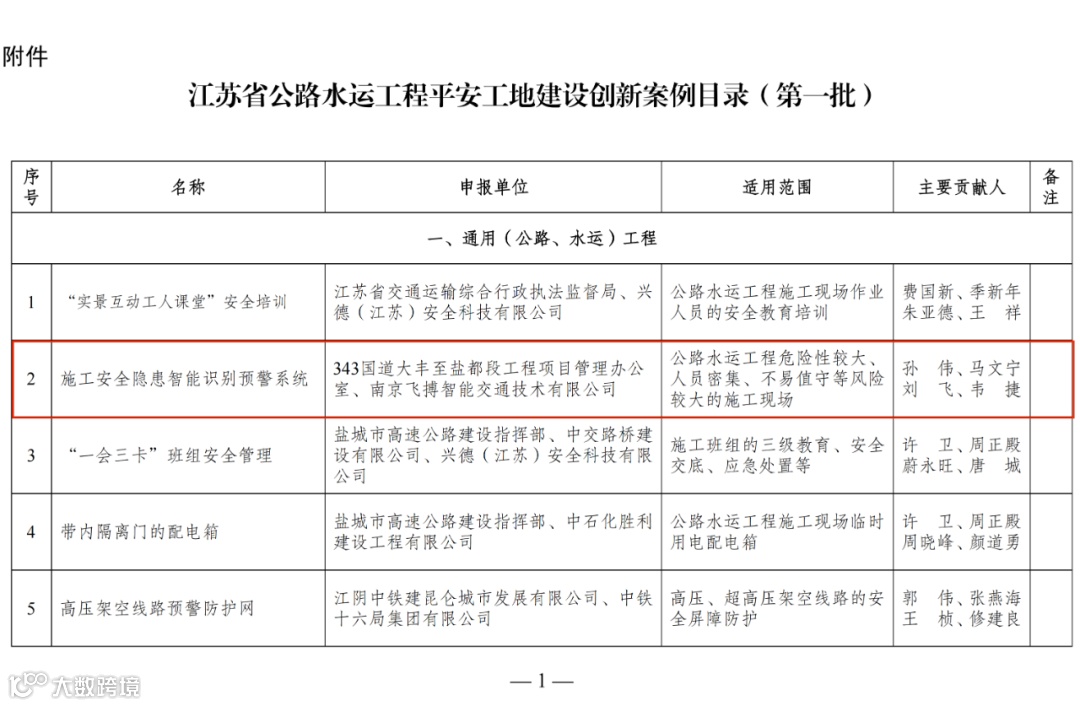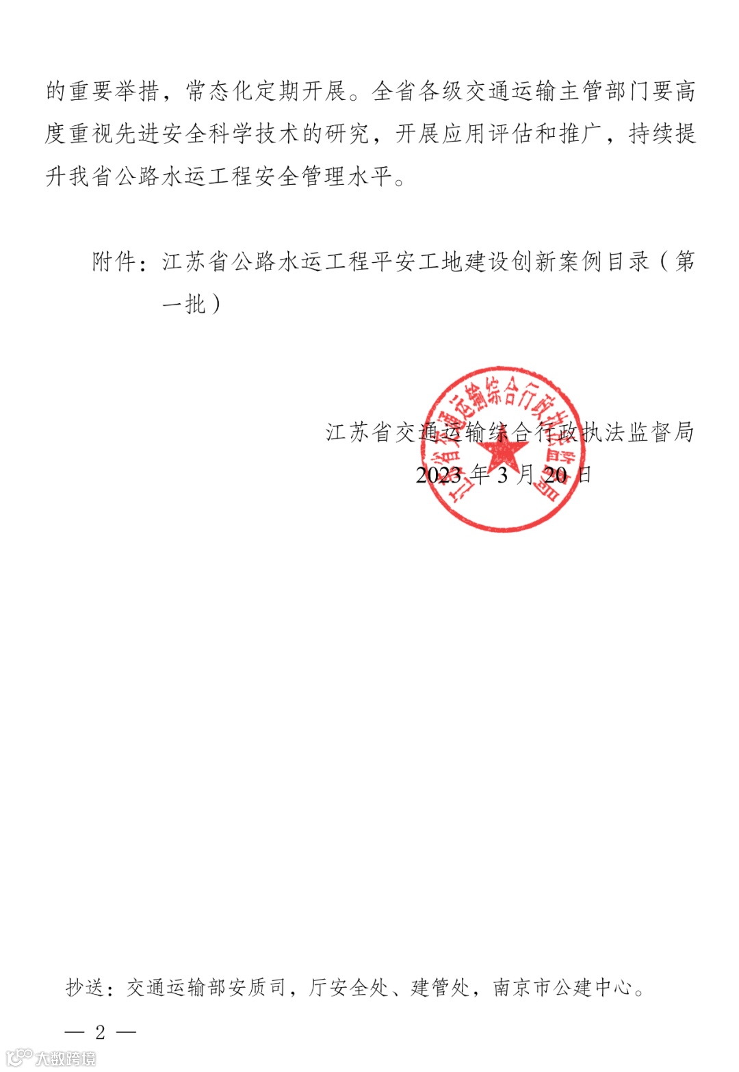 3月20日,省交通综合执法局汇总、评选出全省第一批21个江苏省公路水运工程平安工地建设创新案例并予以发布。