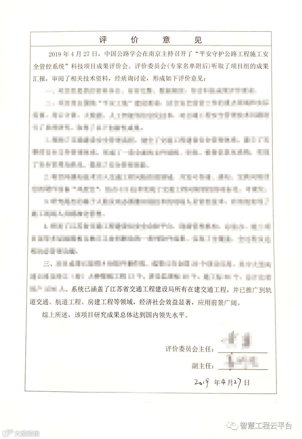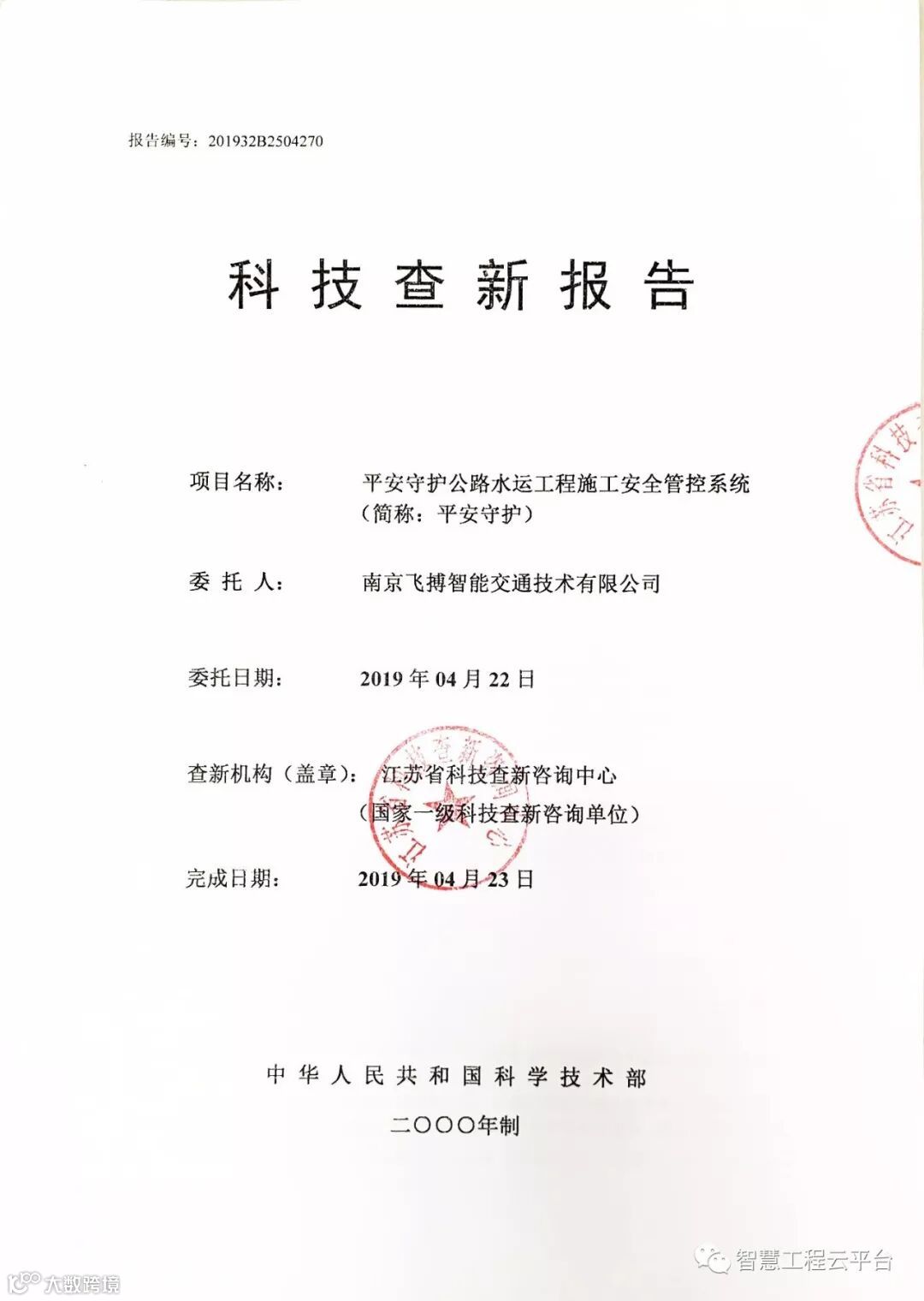 2019年4月27日,由江苏省交通工程建设局和南京飞搏智能交通技术有限公司联合研发的“平安守护公路工程施工安全管控系统”科技成果顺利通过中国公路学会评价。参会专家分别来自交通运输部安全与质量监督管理司、江苏省交通运输厅综合执法监督局、交通运输部公路科学研究院安全中心、东南大学计算机与工程学院、宁波舟山港主通道项目工程建设指挥部。