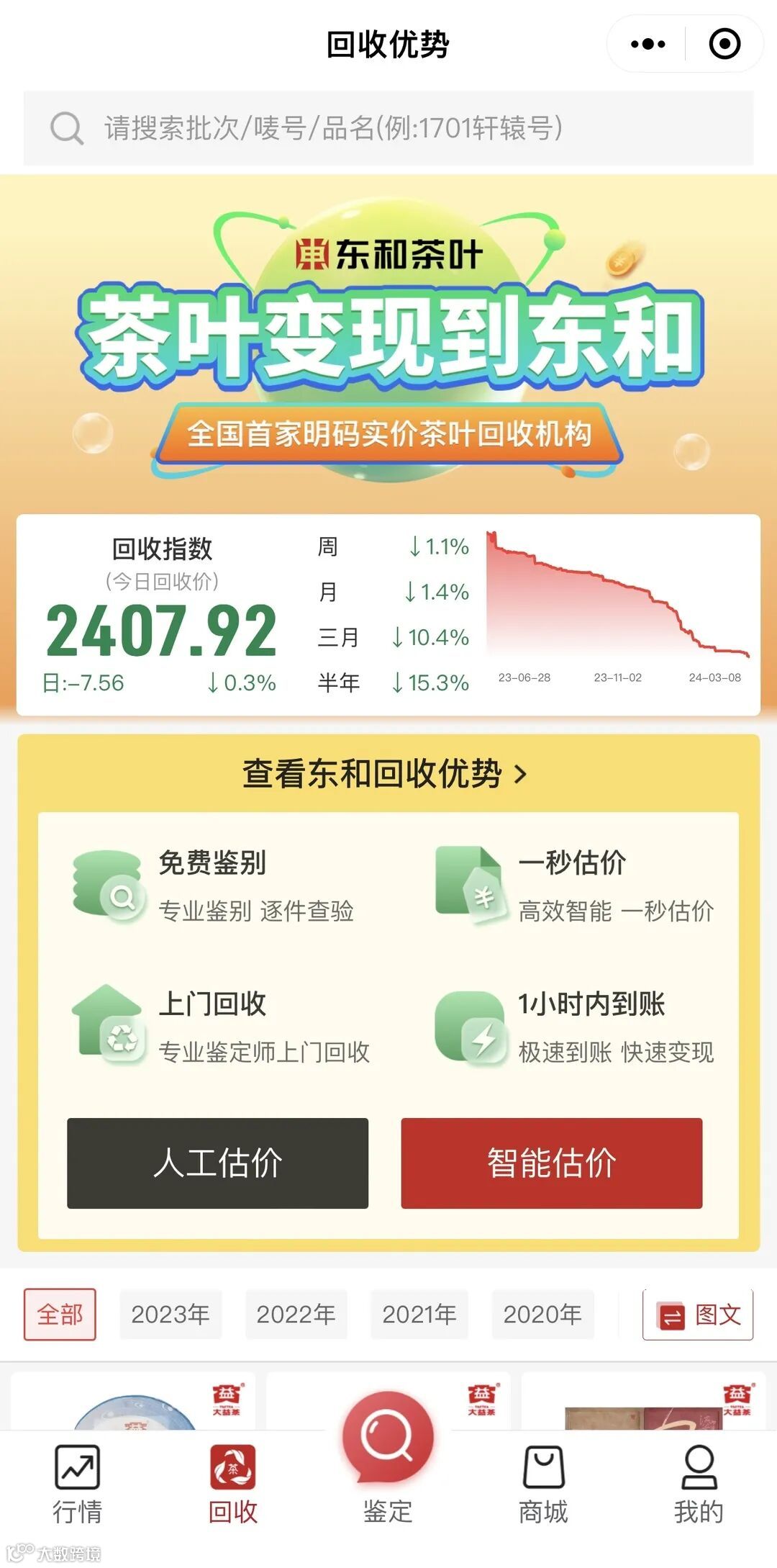 同时东和茶叶APP上的今日回收价,明码回收,童叟无欺!客户更可以通过“智能估价”更快速便捷了解自己的茶叶回收价值,它们帮助许多客户解决了回收与变现的难题。