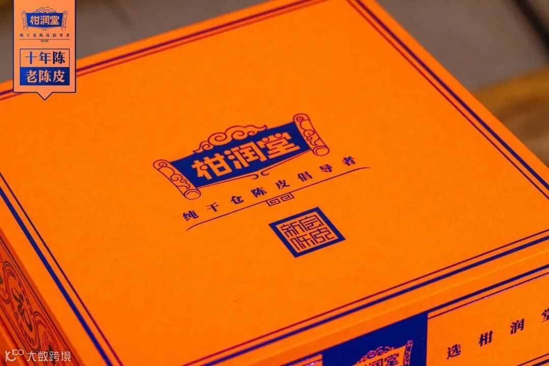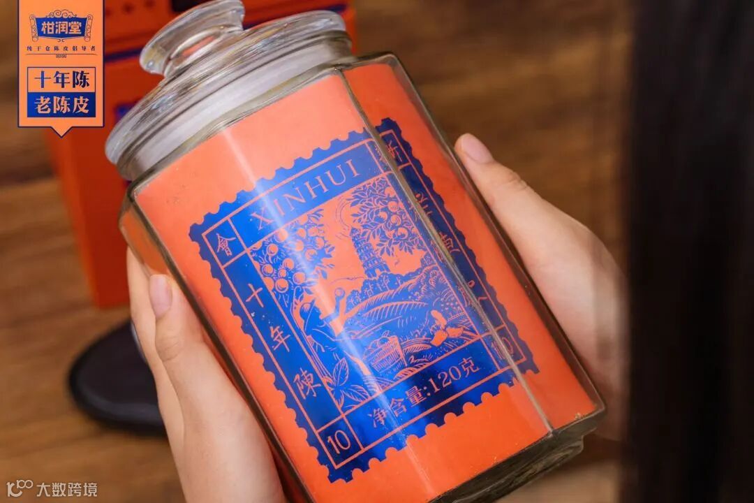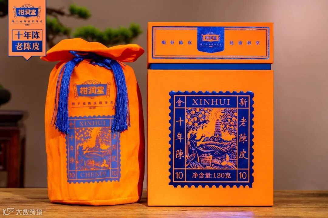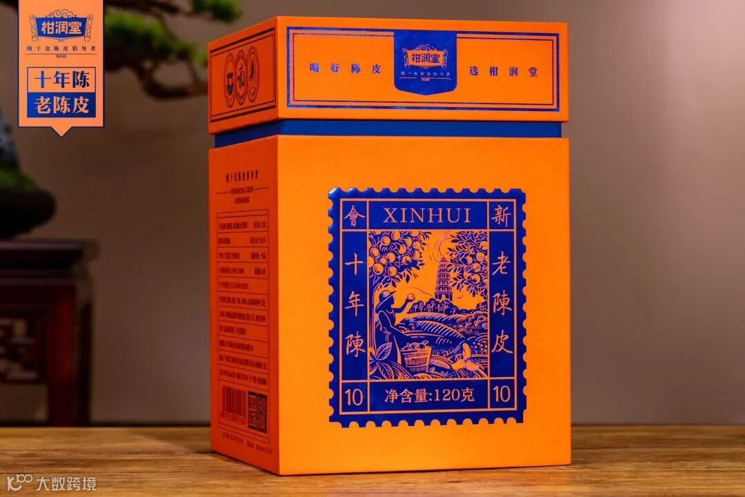 【十年陈·老陈皮】包装,整体以桔红色为色调,图案以复古邮票元素突出老陈皮年份感,