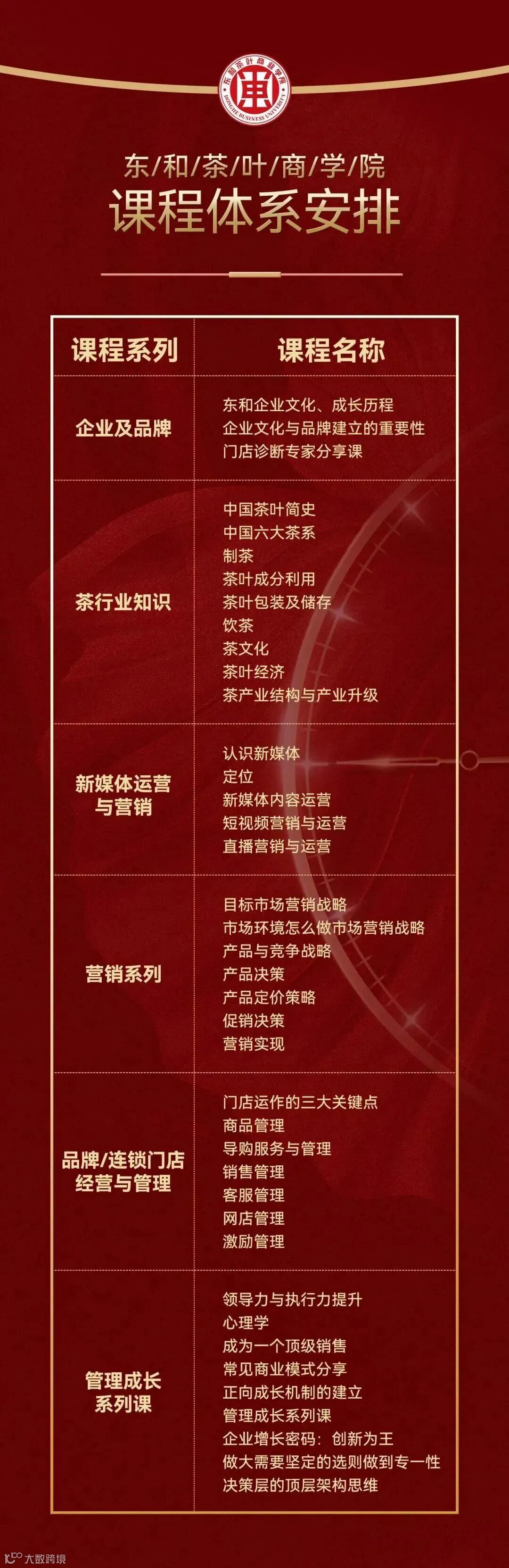 东和茶叶商学院除了整合了茶行业名师资源外,还积极引入跨界优秀人才,为茶行业广大商家提供涵盖企业及品牌、茶行业知识、新媒体运营、营销、门店经营和管理、管理成长系列等多方面的课程;旨在解决茶行业目前面临的问题,如客源减少、线上电商竞争以及未来发展方向不明确等。