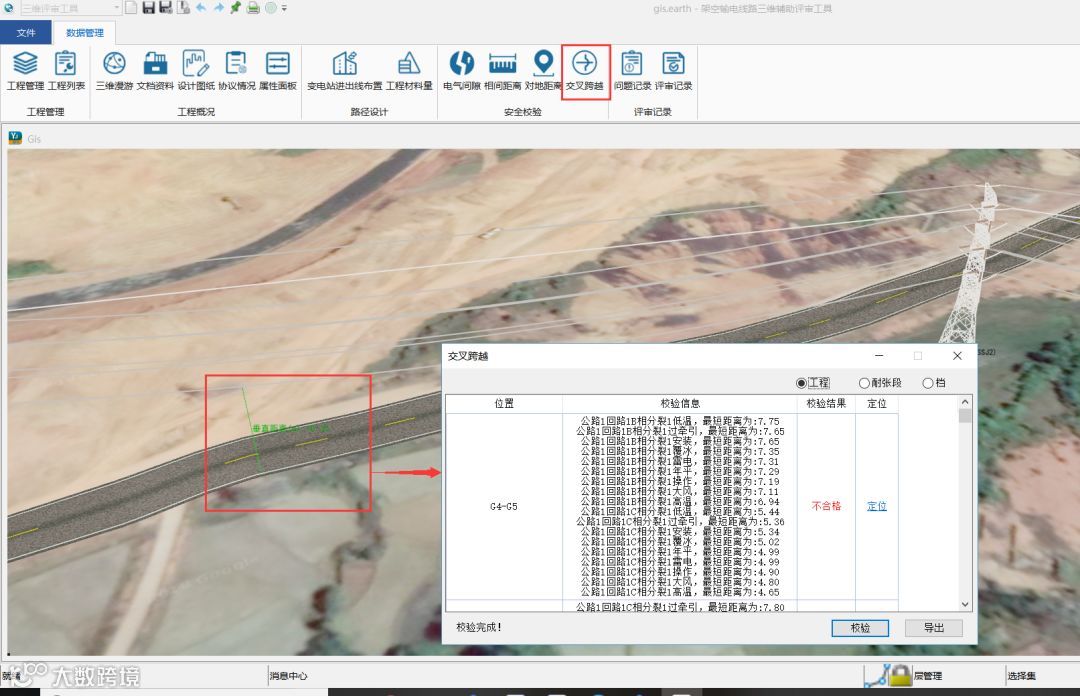 系统可按工程、耐张段或拾取某基铁塔等方式,实现铁塔电气间隙的校验计算,并在视图中标识间隙球,在界面中可快速定位查看检验不合格数据,同时也可导出校验结果。