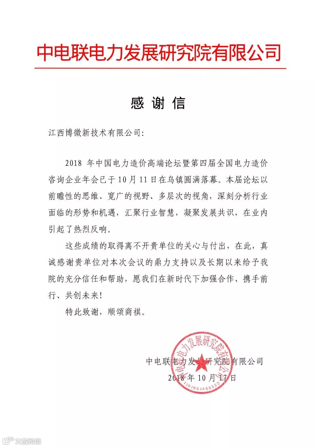 中电联电力发展研究院有限公司向江西博微新技术公司发来感谢信,对博微公司在协办“2018年中国电力造价高端论坛暨第四届全国电力造价咨询企业年会”组织过程中给予的鼎力支持表示诚挚的感谢,感谢博微公司长期以来给予的充分信任和鼎力支持,并期待在新时代下与博微公司加强合作、携手前行、共创未来。