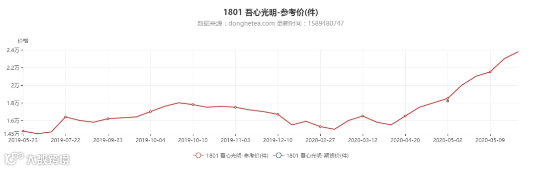 从指数图可以看出, 1801吾心光明在5月1日起一直在上涨,从1.8万元/件,到2.38万元/件,涨幅约32%。