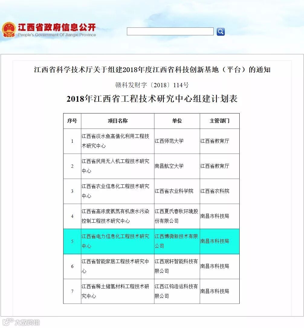 为贯彻落实创新驱动发展战略,加快推进江西创新型省份建设,根据《江西省“十三五”科技创新升级规划》、《江西省人民政府关于创新驱动“5511”工程的实施意见》、《江西省重点实验室管理办法》和《江西省工程技术研究中心管理办法》,省科技厅启动了2018年度江西省科技创新基地(重大科技创新平台培育、重点实验室和工程技术研究中心)的建设工作,经过形式审查、网评、会评和公示等工作程序,江西博微新技术有限公司的“江西省电力信息化工程技术研究中心”成功列入2018年江西省工程技术研究中心组建计划。