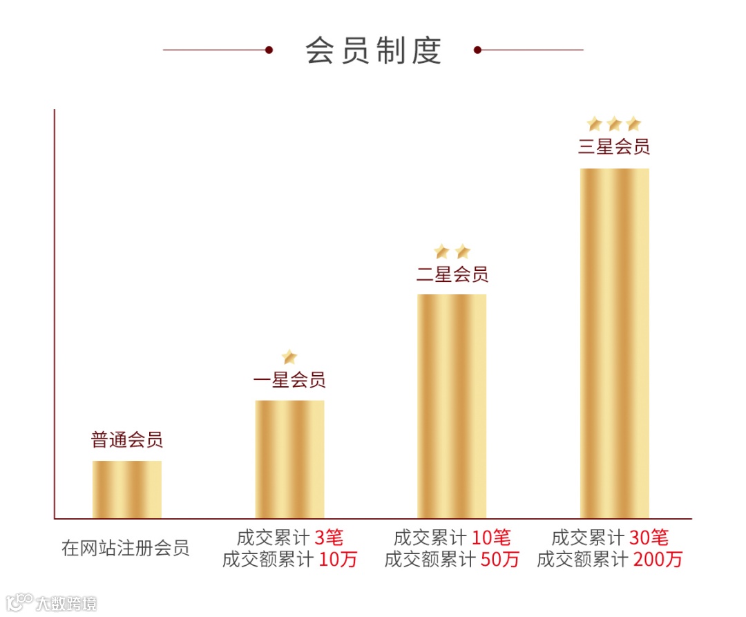 依据您在平台上积累的成交额与次数,划分不同的星级,并获得相应的会员权益。