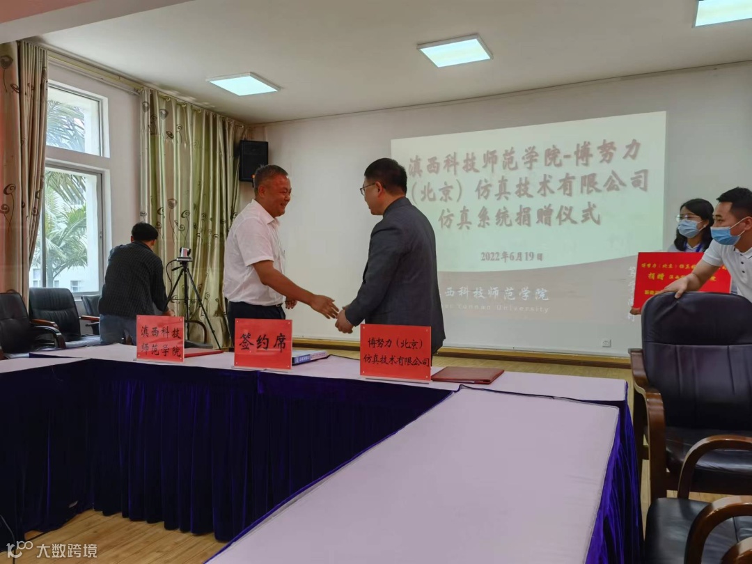 2022年6月19日,博努力(北京)仿真技术有限公司向滇西科技师范学院捐赠新能源发电装备仿真实训软件的签约仪式在滇西科技师范学院隆重举行。滇西科技师范学院校长董大校、副校长段佳美、博努力公司董事长、总经理王廷举出席了签约仪式。双方领导发表了热情洋溢的讲话。