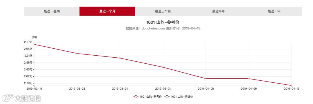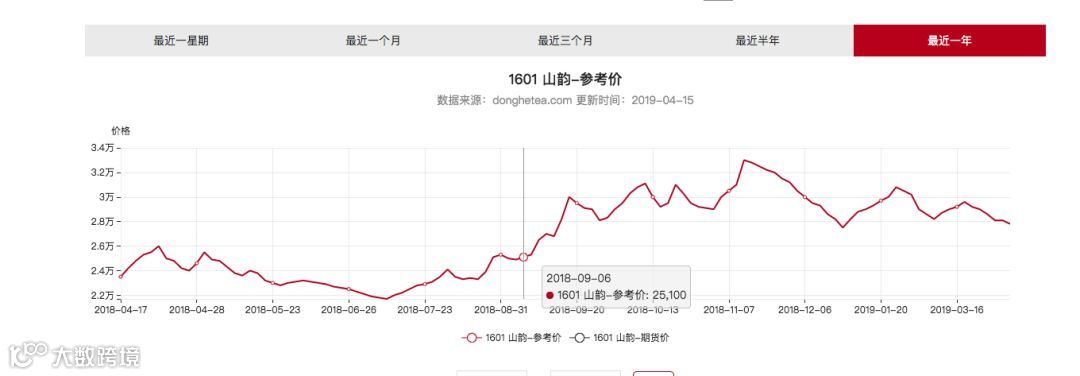 这款也算是名气较大的产品了,这几日同门兄弟“蜜韵”上市,厂方定价还未有最终定论,市场已经闻风而动,加价1.6万元不等,可见投资者的信心。受“蜜韵”影响,16日时山韵关注度立即涌上新的波峰。追溯到2006年,大益出品过五韵礼盒装,延续至今,山韵是一个传承式的产品,品质自然无可挑剔。最初“山韵”发行时,出厂价仅8千多元,入市后疯狂升涨,市场对它的态度是极其积极的,经历过改名,几次上市发布,逐年看涨,算是一个有历史沉淀的产品。近半年的时间里,它的价格不太理想,一度跌到2.75万元,进入3月后,始终无法突破3万元大关。但部分投资者认为,此次蜜韵发布,正是入手处在低谷的山韵的好时机,厚积薄发,借势操作也未为不可。