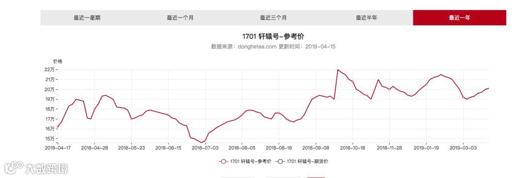 明星产品轩辕号在这一个月的表现还是相当不错的,近期看好,这和产品最初的定位和良好的市场基础分割不开。品质上来讲足够优秀,口碑、品饮反应非常稳定,可见大益在它身上倾注了很大的心血。虽然3月初经历了一个惊险的下跌,低至19万元,但熬过低谷后,关注度开始激增。这和市场整体回调有密切关联,进入3月后市场稳定拉升,出现小波上涨,轩辕号则顺势而为,热度重新回归,市场的需求也逐渐回暖,市面流通的货量减少,又成为很有看头的产品。