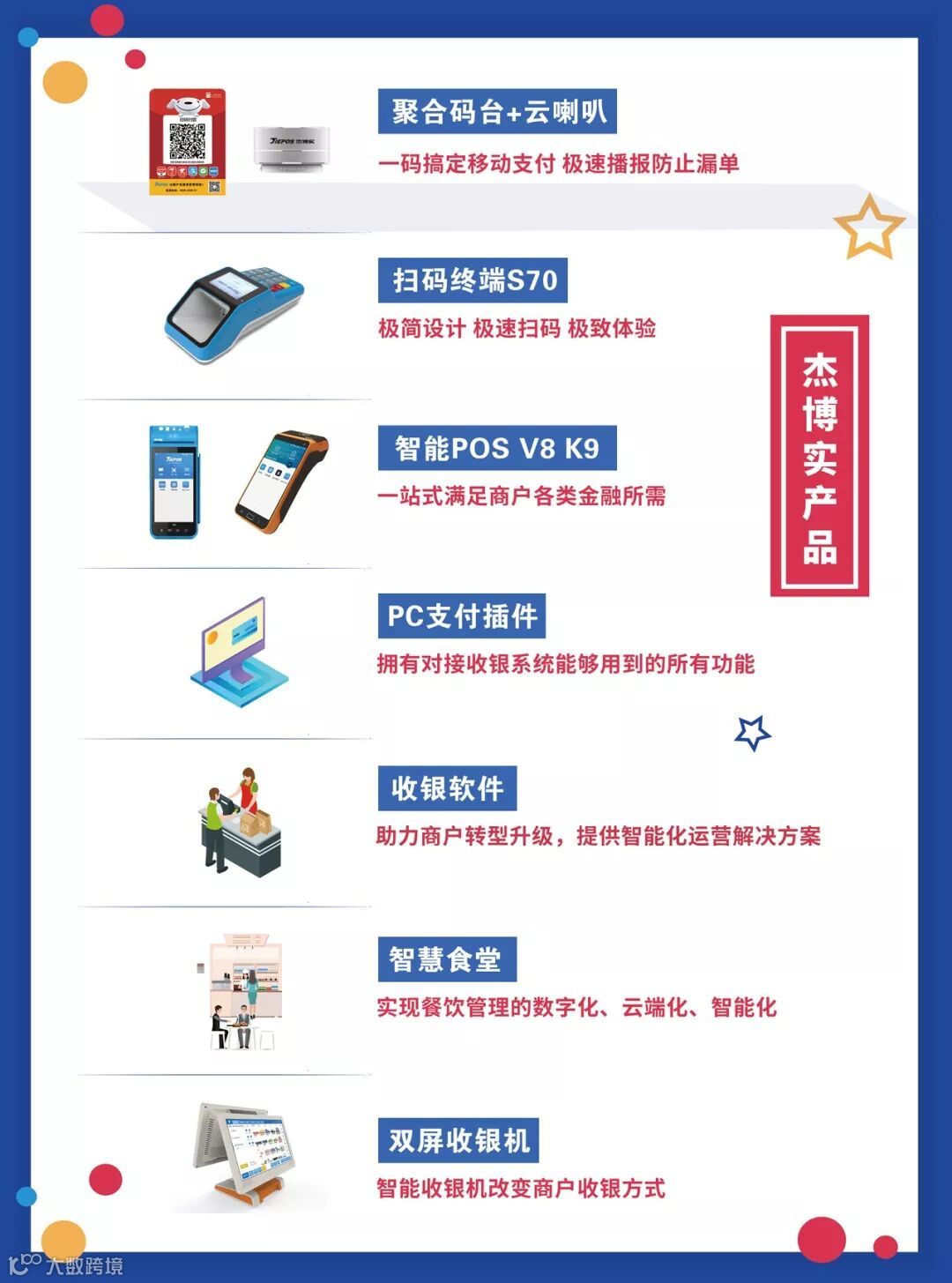 杰博实依靠专业的团队、雄厚的技术力量,以“让商户生意更好更轻松!”为使命,专注于为线下实体商户提供包括聚合支付、会员营销、CRM、金融增值产品等在内的全方位智能商业服务!