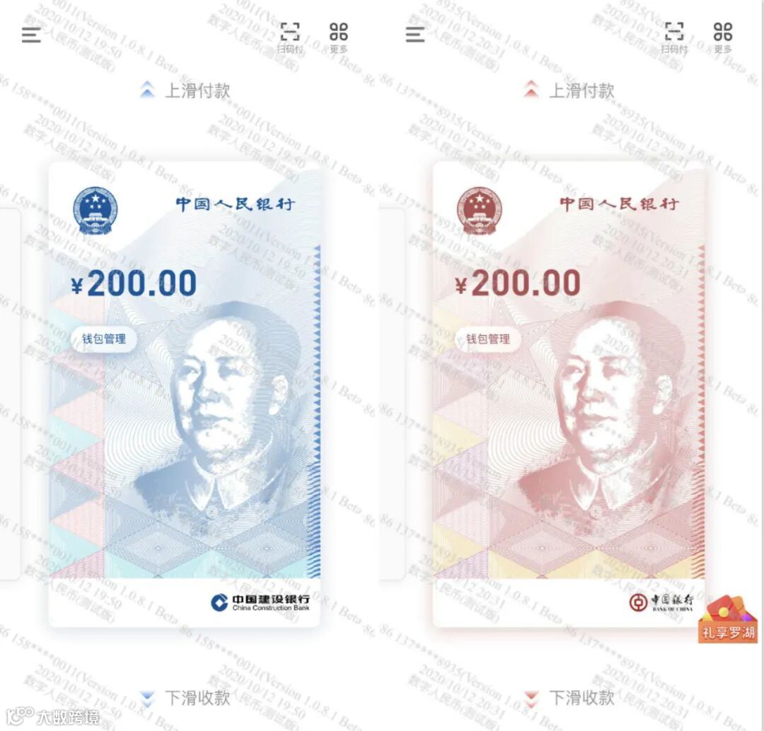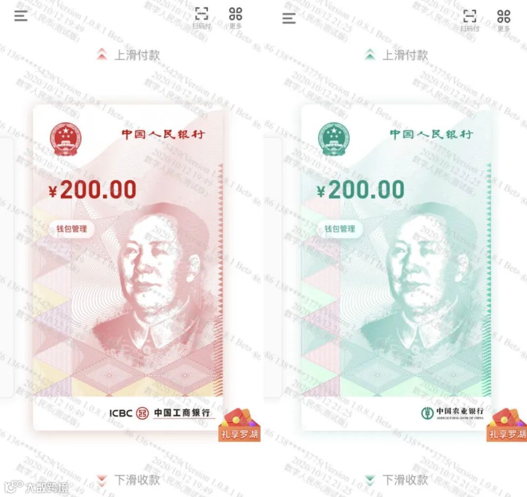 从微博网友晒出的图片发现,加入数字人民币红包领取服务的有工农中建四大行,所展示的数字人民币外观基本一致,但底色并不相同,工行和中行均为红色,颜色一深一浅,建设银行为蓝色,农业银行为绿色。