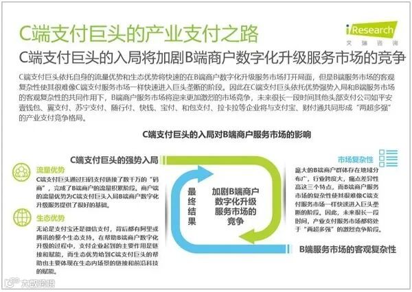 C端支付巨头的入局将加剧B端商户数字化升级服务市场的竞争,未来很长一段时间其他头部支付公司如拉卡拉、随行付、壹钱包、苏宁支付等企业将与支付宝、财付通共同形成“两超多强”的产业支付竞争格局。