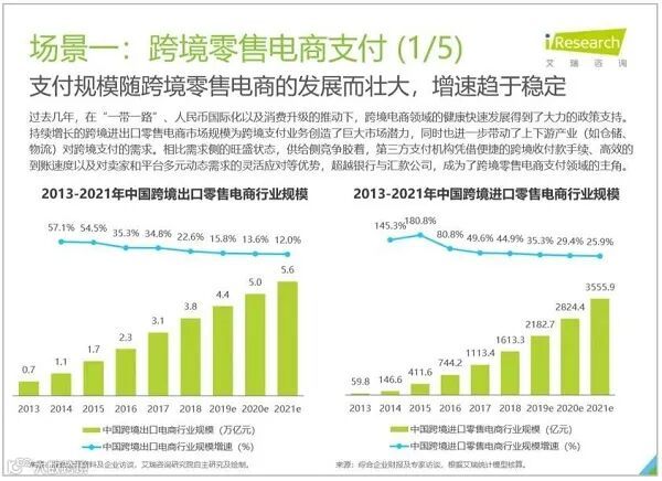 过去几年,在“一带一路”、人民币国际化以及消费升级的推动下,跨境电商领域的健康快速发展得到了大力的政策支持。支付规模随跨境零售电商的发展而壮大,增速趋于稳定。