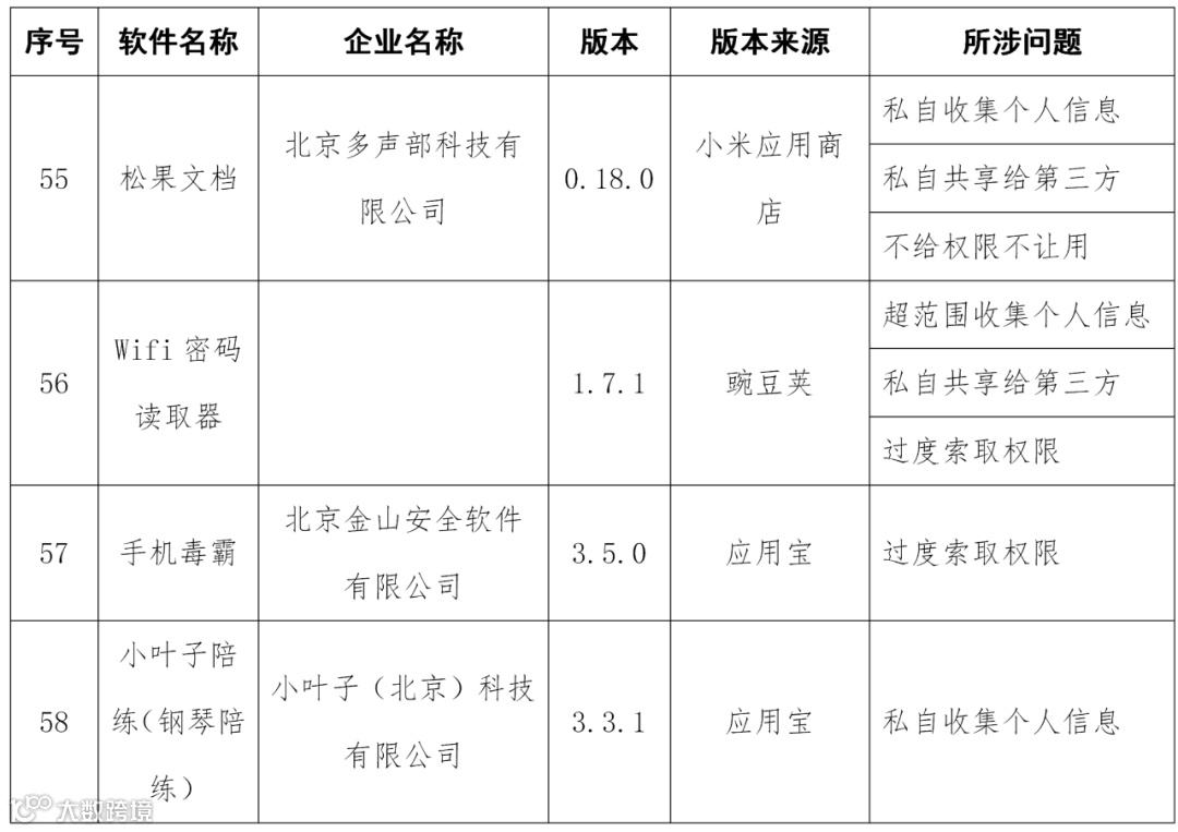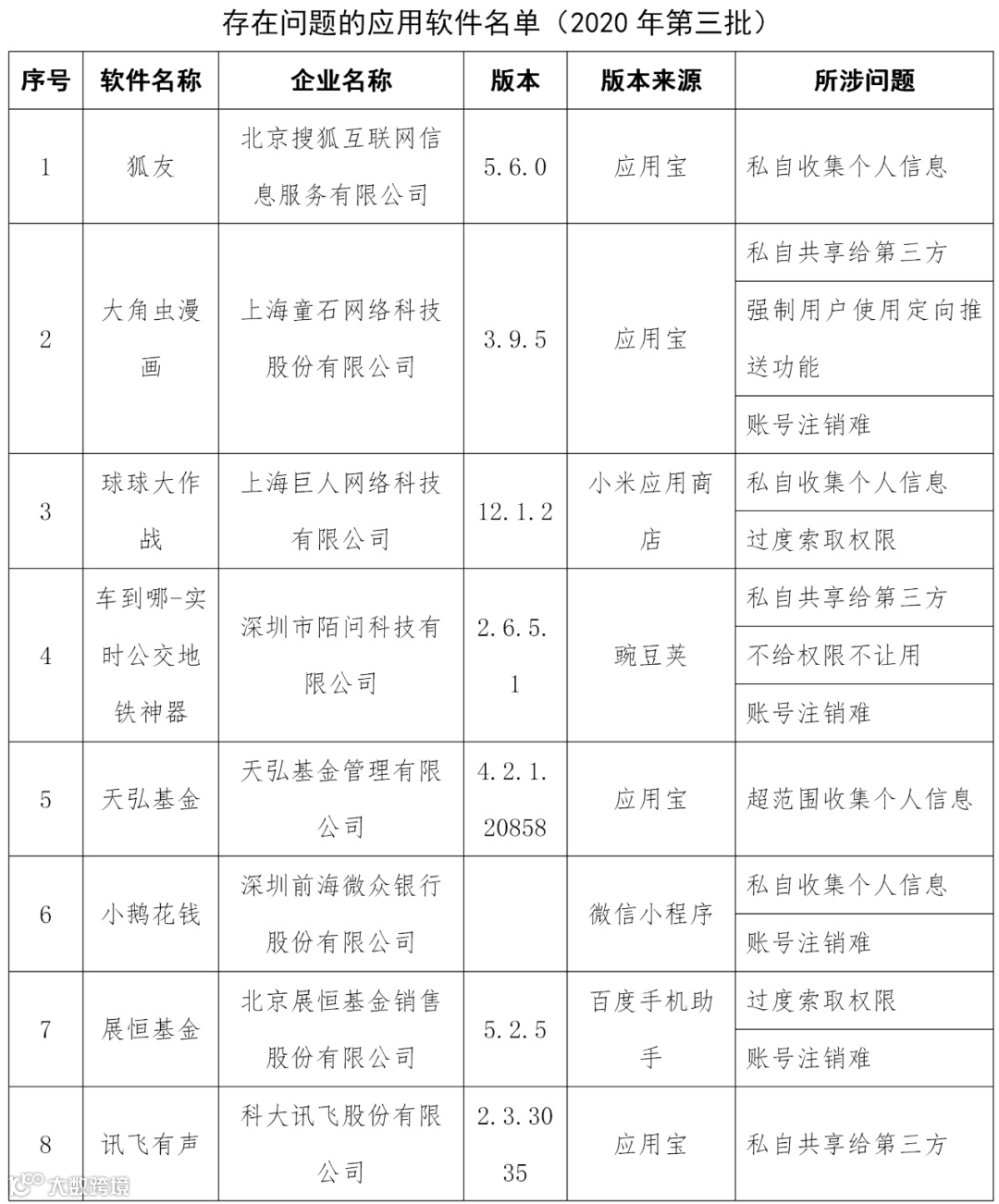 小花钱包、还呗涉嫌私自共享给第三方的问题。另外有四家基金公司旗下App因涉嫌超范围收集个人信息、过度索取权限、私自收集个人信息、不给权限不让用等问题被点名。