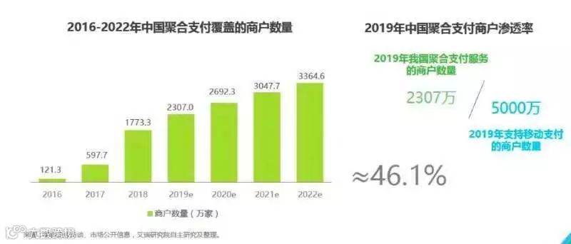 2014年聚合支付随着线下扫码支付发展兴起,并在2016年-2018年迎来翻倍增式爆发增长,艾瑞认为目前聚合支付市场已经进入稳定发展期,并预计目前超8万亿的市场体量未来增速或有回落,但仍能保持稳定的同比增长。