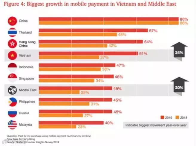 据国外媒体报道,根据普华永道会计事务所2019年全球消费者洞察力(Global ConsumerInsight Survey )调查显示,越南是全世界移动支付增长最快的国家,与去年相比增长了24%,61%的消费者使用这类服务。