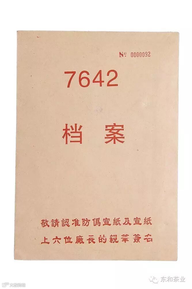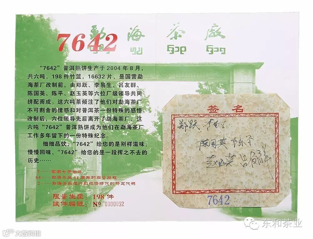“ 7642 ” 普洱熟饼生产于2004年8月,共六吨,198件竹篮,16632片,是国营勐海茶厂改制前,由郑跃、李易生、吕友群、陈国英、陈平、赵玉英等六位厂级领导共同拼配而成。这六吨茶倾注了他们对勐海茶厂不可割舍的情感和对普洱茶一份特殊的感悟。改制后,六位领导先后离开了勐海茶厂,这六吨 “ 7642 ” 普洱熟饼成为他们在勐海茶厂工作多年留下的一份特殊纪念。