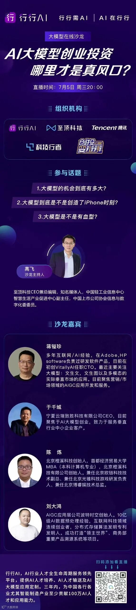 7月5日周三20点,共聚行行AI沙龙,交流AI大模型创业投资,哪里才是真风口?