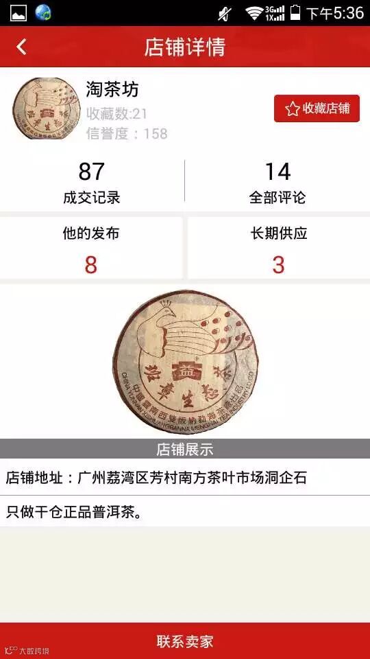 如果您想要了解哪一家【明星店铺】的信息,只要点击【进入店铺】按钮,即可进入【店铺详情】页面。在这里,我们不仅可以看到该店铺在【茶通】的【信誉度】、【成交记录】、其他会员对他的【全部评论】……还可以在该店铺的【成交信息】中查看到货品的产品信息、【成交价】等内容,让大家了解到及时、真实的茶行业行情资讯。