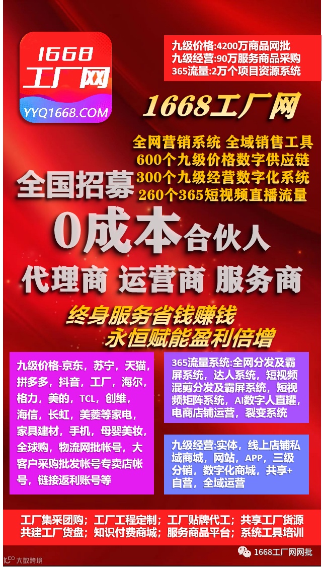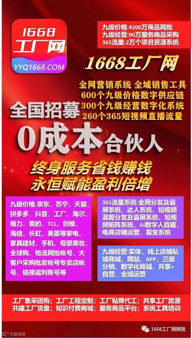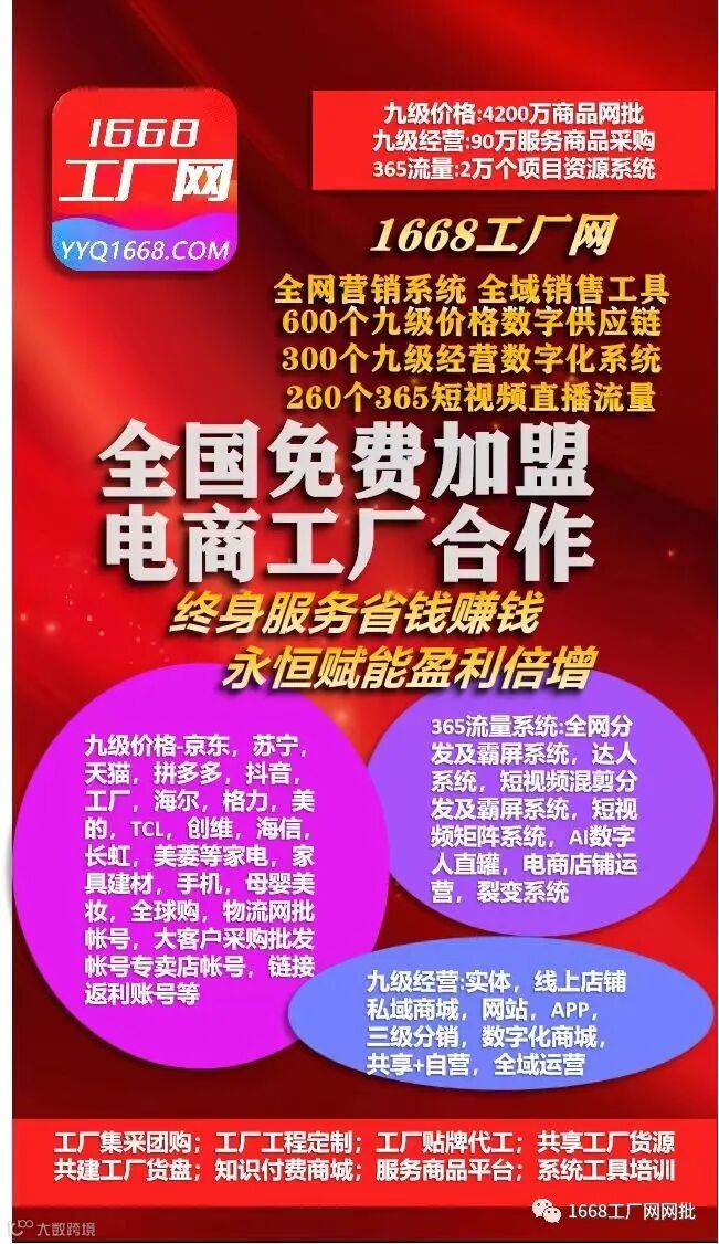 专业为全国客户打造全网营销系统,全域增长体系!经济不好,帮你梳理补充升级供应链体系,经营系统,流量系统!打造全网经营系统,全域增长体系!全国每天二三个客户老板加入1668工厂网,学员,客户,合伙人大多数都可以年收入30-50万,50-100万,100-300万甚至更多!