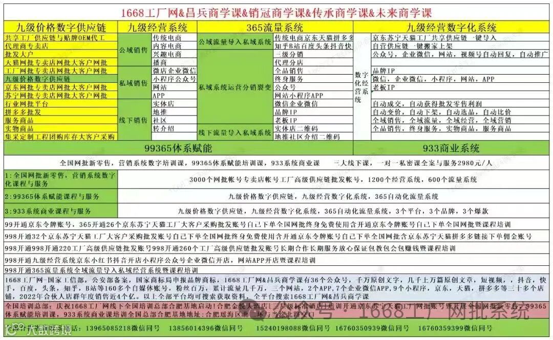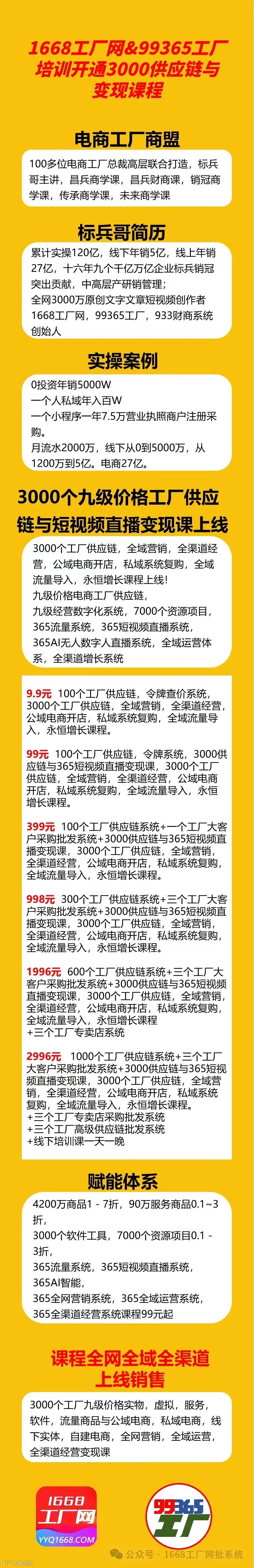 赚钱升级必备供应链,必备经营系统,必备引流技术与系统---1668工厂网&昌兵商学课,升级补充你的供应链,升级你的经营系统,升级你的引流客流流量与留存系统,主要课程: 九级价格数字供应链,九级经营数字化系统,365数字系统全网引流技术系统。全案输出数字资源项目。