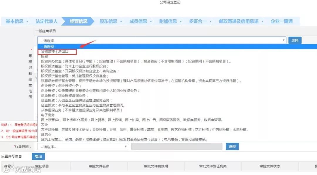步骤三:填报企业信息后,在填写经营信息界面,在一般经营项目下拉框中选择“货物或技术进出口”。