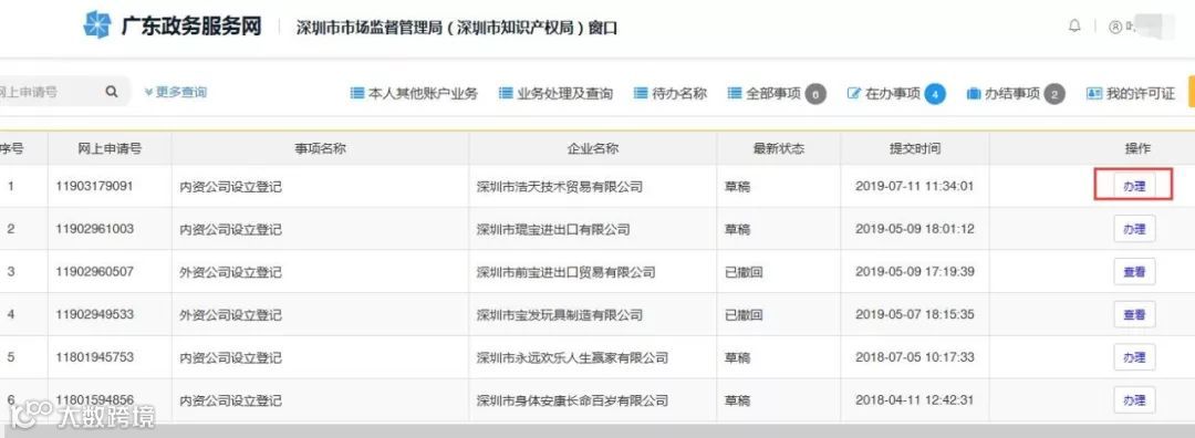 步骤六:重新登录市场监管局登记申报系统,找到已暂存的草稿,点击“办理”。