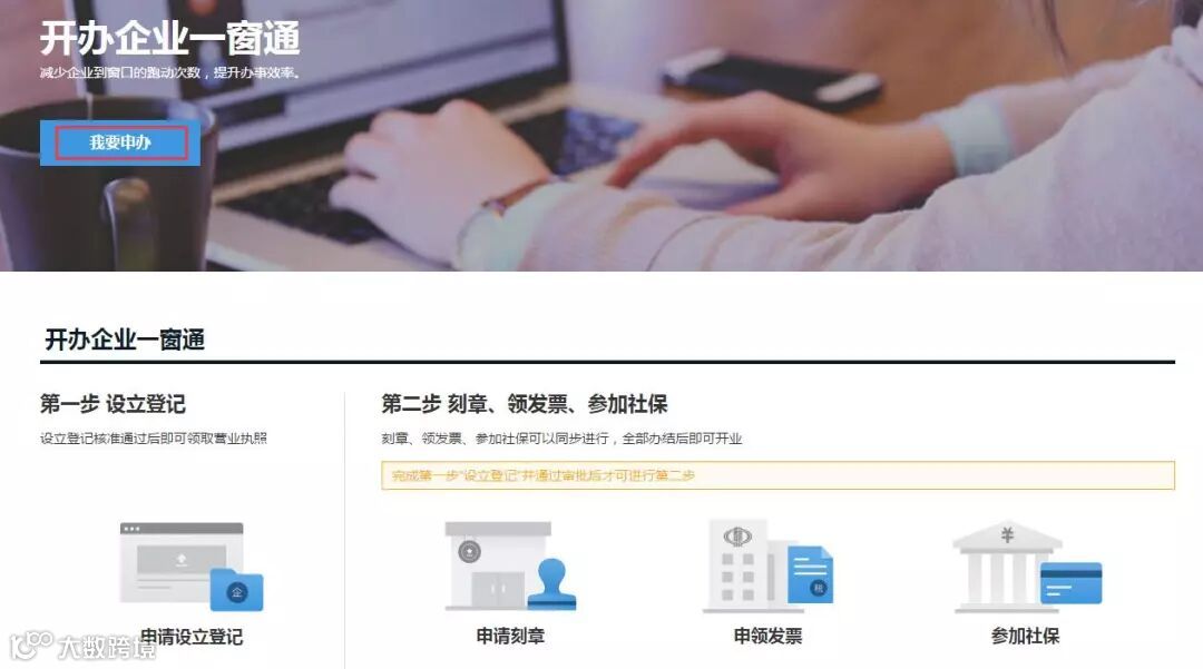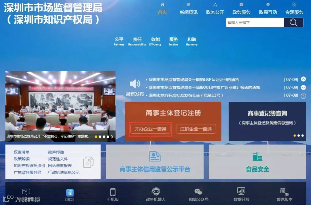 步骤一:登录“市场监管局官网首页”点击“开办企业一窗通”。