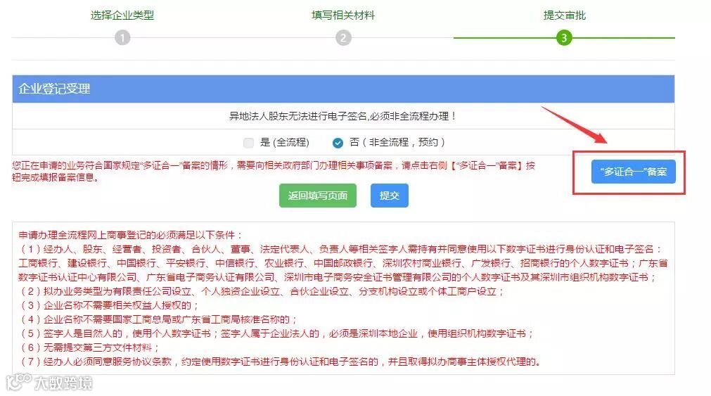 步骤五:在广东省多证合一备案平台勾选“海关进出口货物收发货人备案”框,点击“合并办理”进行具体的备案信息录入申报流程。