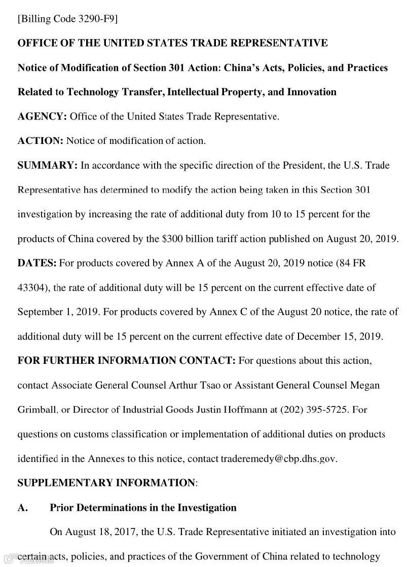 刚刚,美国当地时间2019年8月28日,美国贸易代表办公室官网发布通知,确认针对中国输美3000亿美元产品(LIst 4清单)关税税率由原定的10%提高至15%,按两个批次执行,对3000亿美元加征关税产品分为A、B两个清单,“List 4A”清单中的产品将于美国东部时间9月1日开始正式征收15%的关税,“List 4B”的清单中的产品将于美国东部时间12月15日开始正式征收15%的关税。