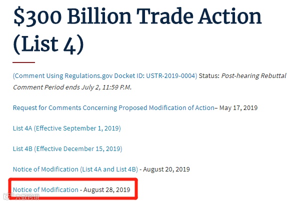 另外,美国贸易代表办公室目前对2500亿美元中国输美产品关税税率从25%提高至30%正征求公众意见,需在9月20日之前提交,并拟定于2019年10月1日生效。