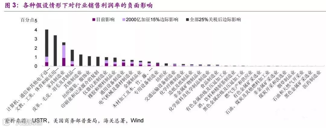 据光大证券测算,在悲观的情景假设下,如果全部中国对美出口商品被加征25%的关税的情况下,部分行业销售利润率边际上会受到影响,文教、美工、体育和娱乐用品制造业、计算机、通信和其他电子设备制造业等影响居前。