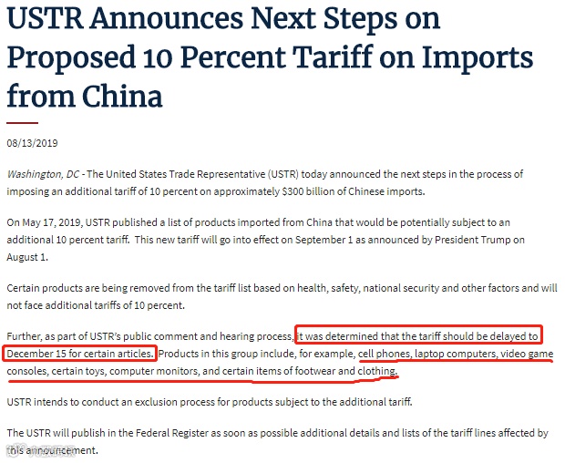 推迟了手机、笔记本电脑、游戏机、部分玩具、电脑显示器、部分衣服鞋帽等占比59%的商品的征税日期至12月15日; -