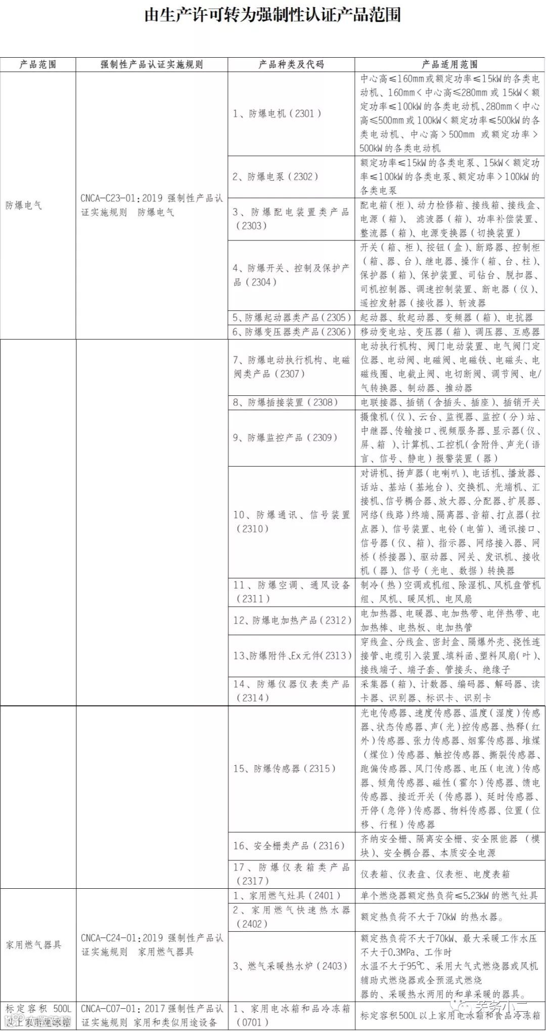 自2019年10月1日起,防爆电气、家用燃气器具和标定容积500L以上家用电冰箱(具体产品范围和强制性产品认证实施规则可点击文末“阅读原文”查看)纳入CCC认证管理范围,各指定认证机构(认证机构和实验室指定工作将另行公告)开始受理认证委托;各省、自治区、直辖市及新疆生产建设兵团市场监管局(厅、委)(以下简称省级市场监管部门)停止受理相关生产许可证申请,已受理的依法终止行政许可程序。