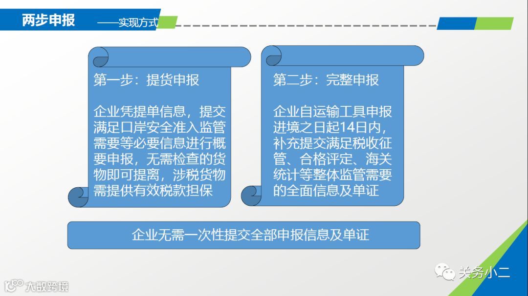 在“两步申报”通关模式下,第一步,企业概要申报后经海关同意即可提离货物;第二步,企业在规定时间内完成完整申报。