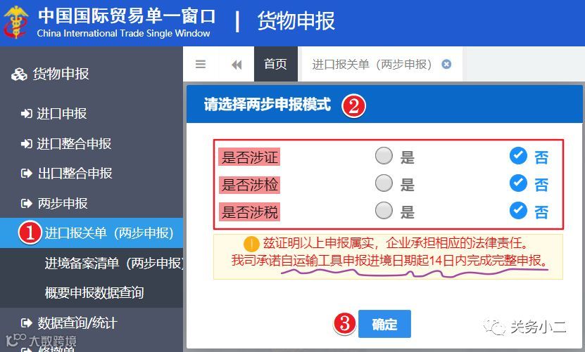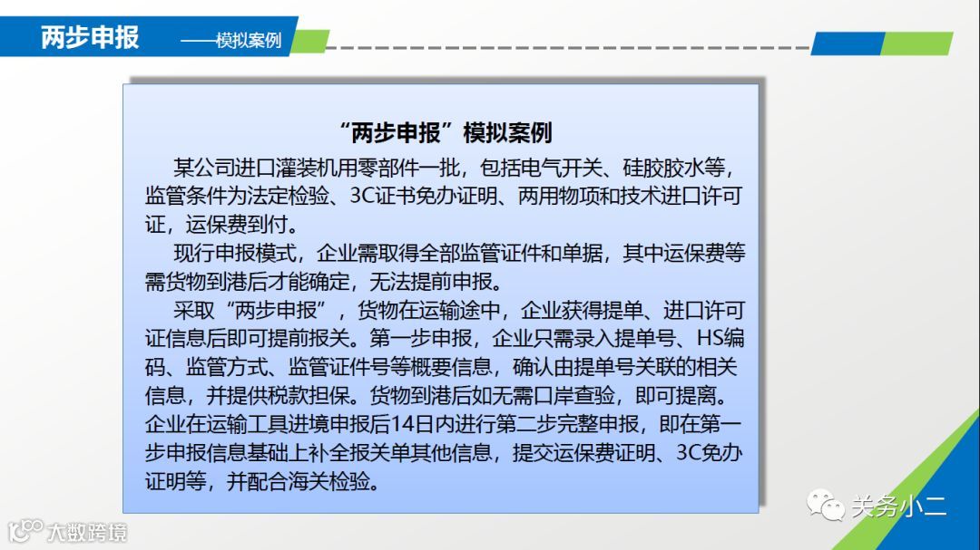 大白话解析:出口货物不参与;转关业务不参与;失信企业不可参与;对应税货物,企业要提前向直属海关关税职能部门提交税收担保备案申请方可参与两步申报;软件进口等无实际货物进境的不可参与;不经过上述指定试点关区进境货物的不可参与;所涉监管证件未联网的不可参与(后文以附联网证件清单)。